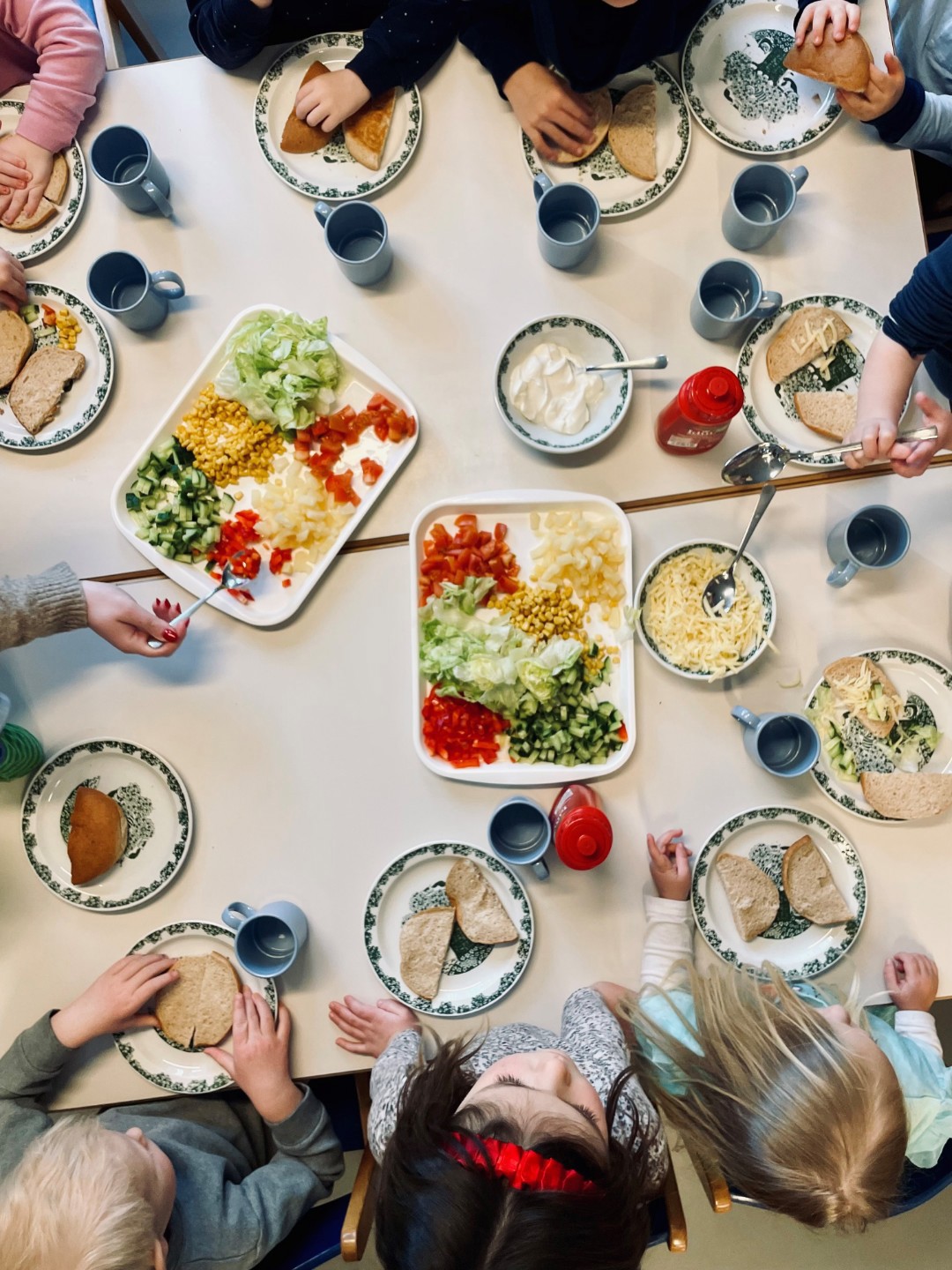 Fokus på et godt, sunt, variert og riktig kosthold til små mennesker som skal vokse seg store. 🥑🍓🍑🥦🍉🥝🧆🍝🍗🥩🍞 Barna får alle måltider de trenger i barnehagen hver dag. Vi serverer havregrøt hver morgen og lager varmt måltid fra bunnen av en til to ganger per uke der vi varierer mellom fisk, kjøtt og vegetar retter. Frukt og grønt har en viktig rolle i alle måltidene i barnehagen.